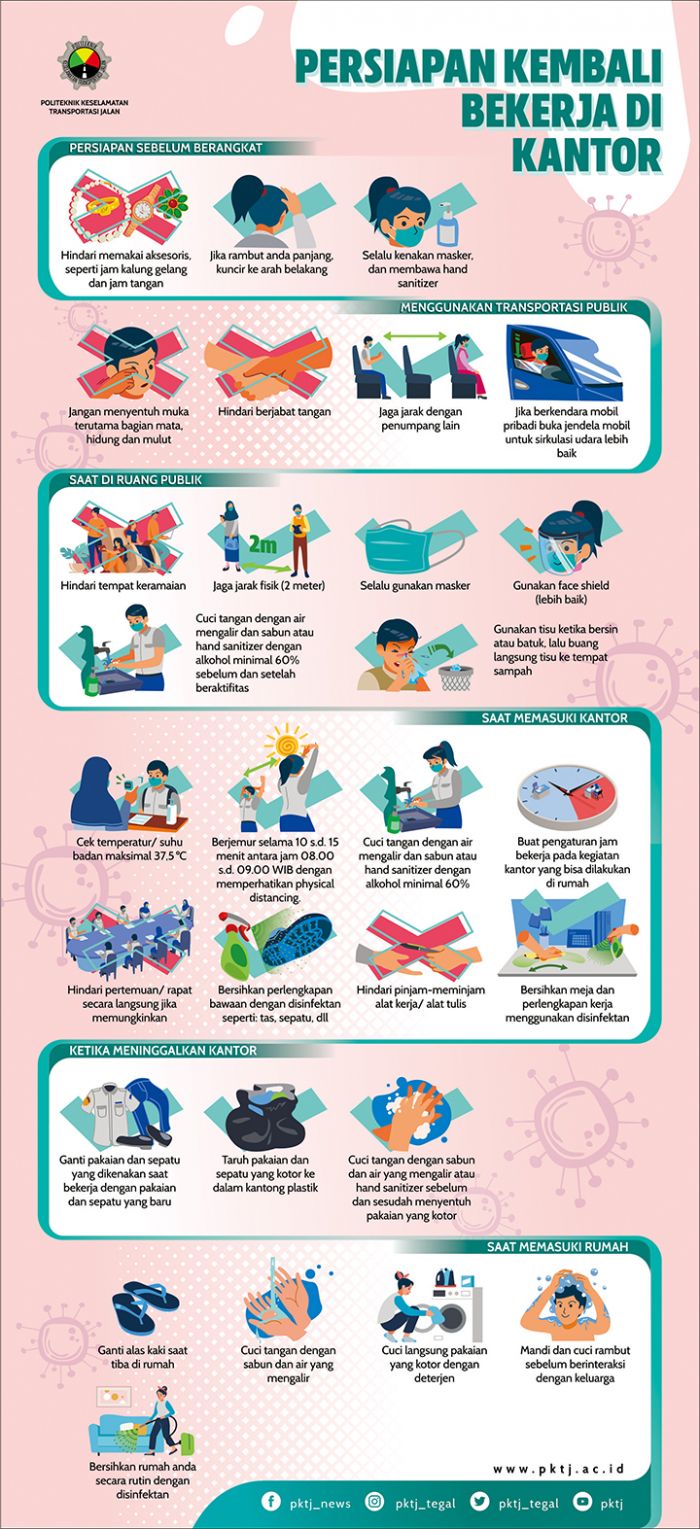 Menindaklanjuti Keputusan Presiden Nomor 11 Tahun 2020 tentang Penetapan Kedaruratan Kesehatan Masyarakat Corona Virus Disease (COVID-19) dan Keputusan Presiden Nomor 12 Tahun 2020 tentang Penetapan Bencana Nonalam Penyebaran Corona Virus Disease (COVID-19) sebagai Bencana Nasional, serta memperhatikan arahan Presiden Republik Indonesia untuk menyusun tatanan normal baru yang mendukung produktivitas kerja namun tetap memprioritaskan kesehatan dan keselamatan masyarakat, perlu dilakukan perubahan sistem kerja Pegawai Aparatur Sipil Negara agar dapat beradaptasi terhadap perubahan tatanan normal baru produktif dan aman COVID-19. Oleh karena itu, ada beberapa tips Persiapan Kembali Bekerja di Kantor yang terdiri dari: